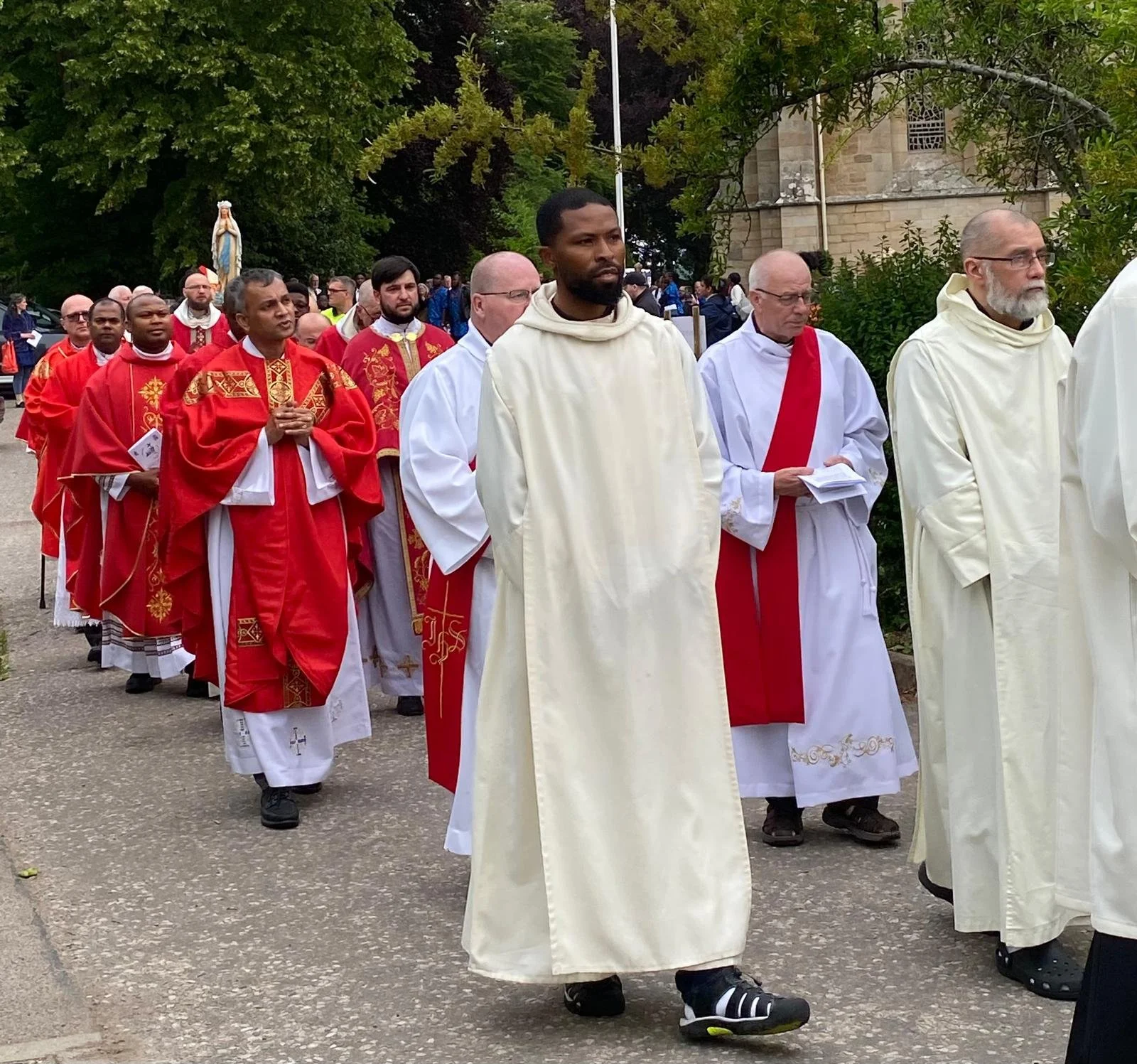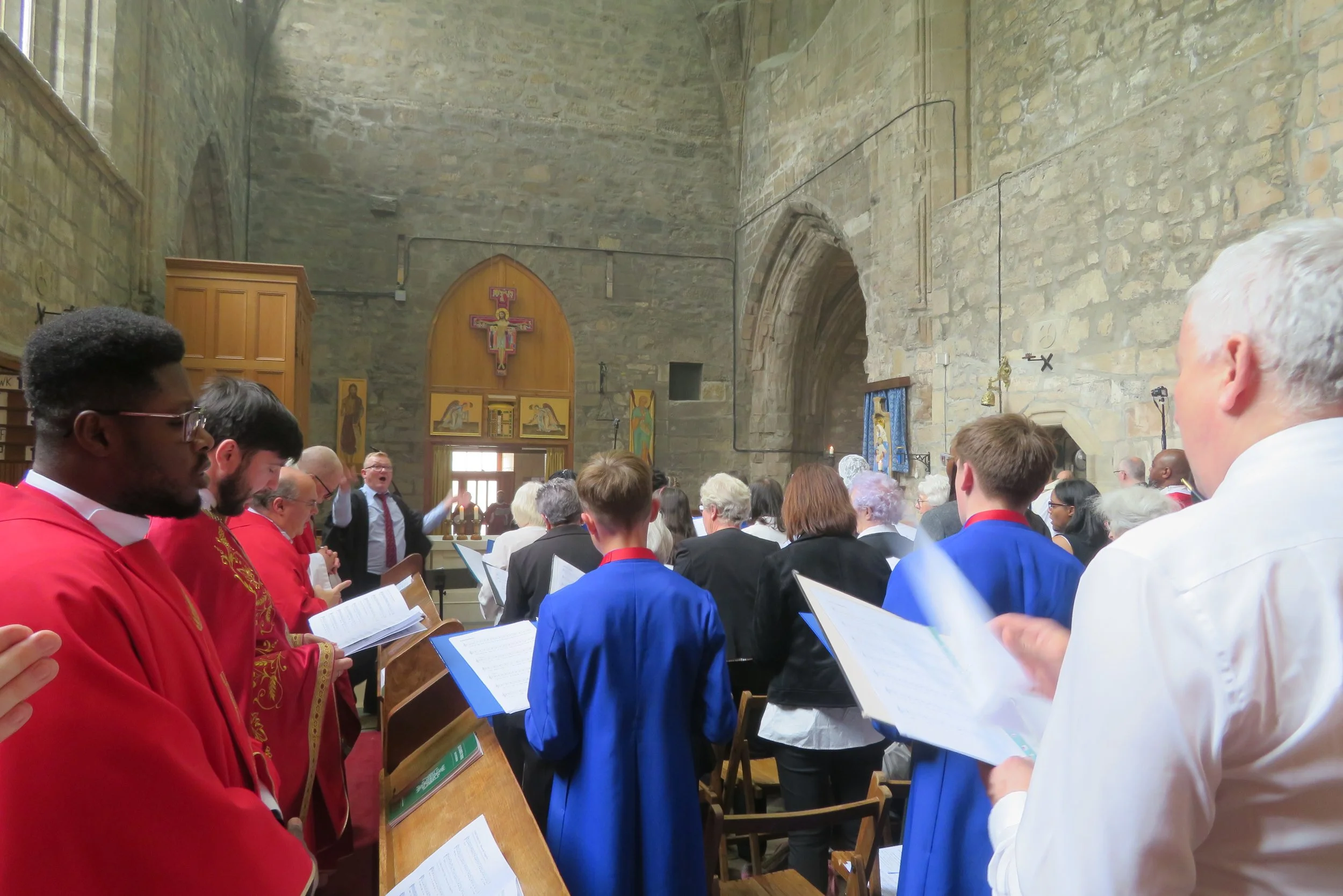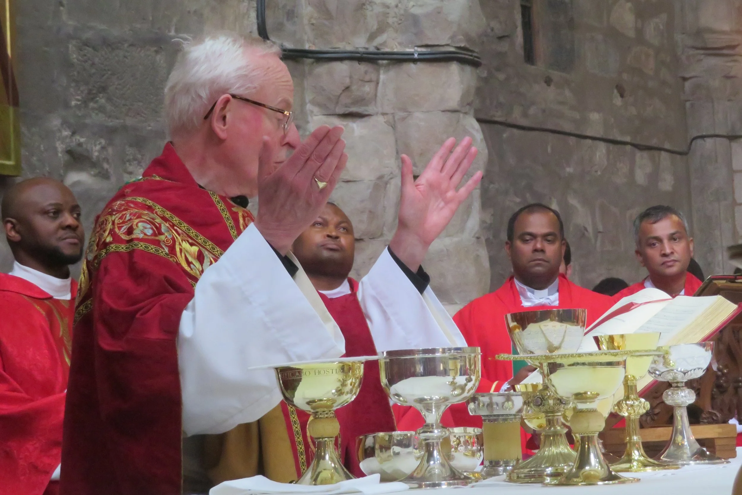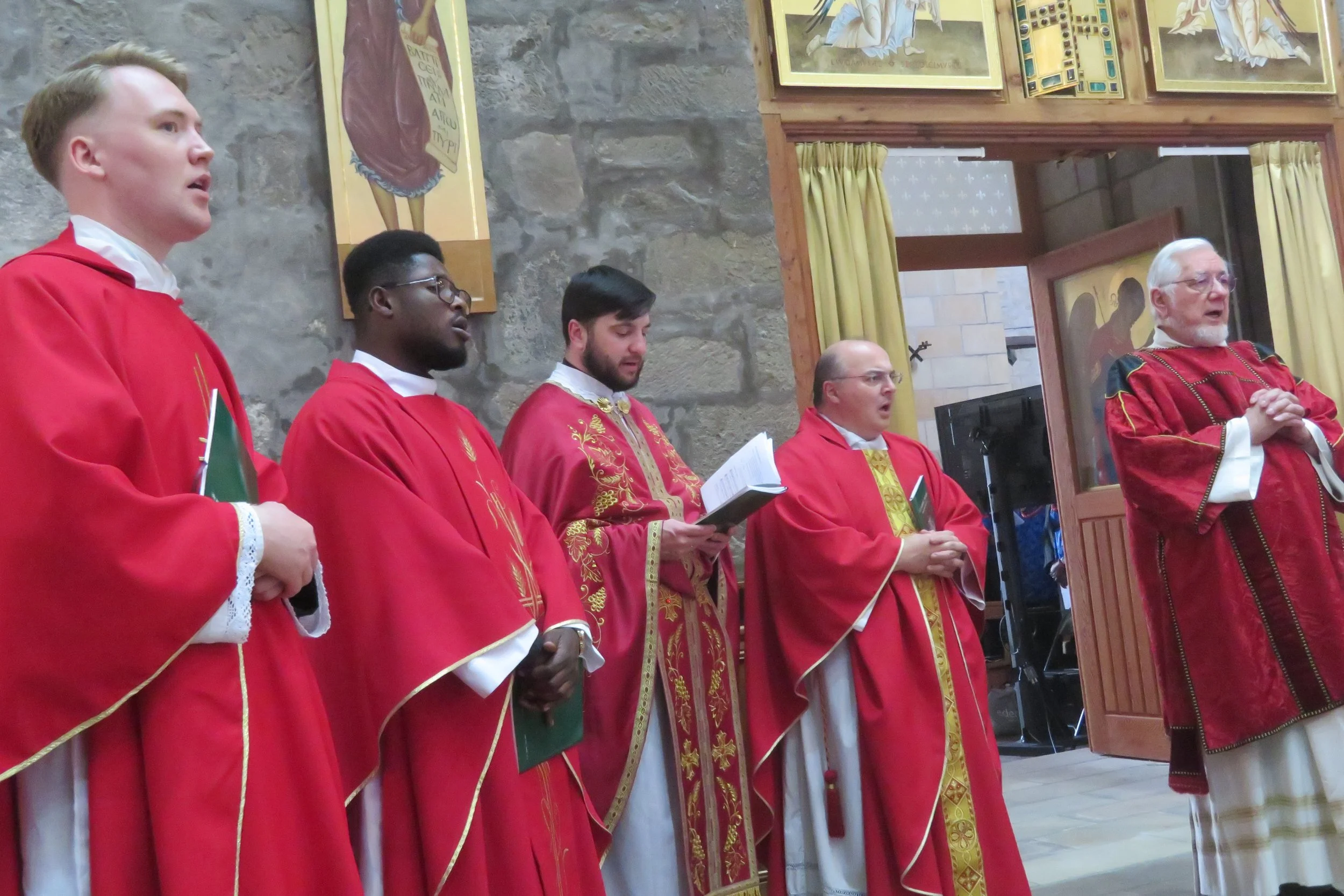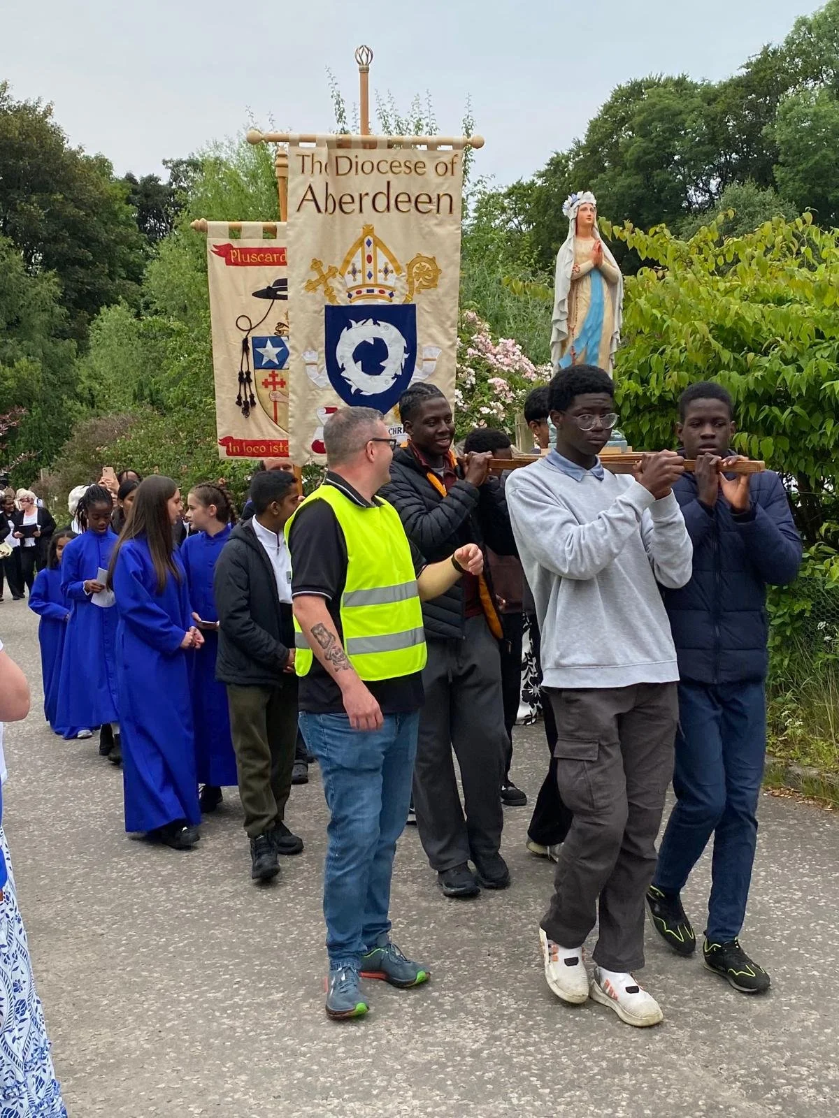 As for the Mass liturgy: it was enhanced by a good group of servers from the Diocese, led by our very own Doctor Derek Kelly, while all ultimately controlled by the ever-calm and cheerful George Brand, the Diocesan Master of Ceremonies. We had present also at least five deacons, and maybe 17 guest Priests. Among them was Elgin’s Fr. Aidan Matheson, ordained by Bishop Hugh only two days previously in Aberdeen Cathedral, on the Feast of the Sacred Heart. The Diocesan Choir was led by John Horton; Ronnie Leith played the organ as ever, and the Nigerian Choir sang and played with the facility of professionals. Six large hired Video Screens, together with a special sound system, kept everyone everywhere fully in touch with the ceremony as it unfolded, in spite of so many awkward intervening walls. The control of the transmitted film was done by the Community’s Live-Stream Brother, deploying an array of fixed cameras to enable multiple shots and views.