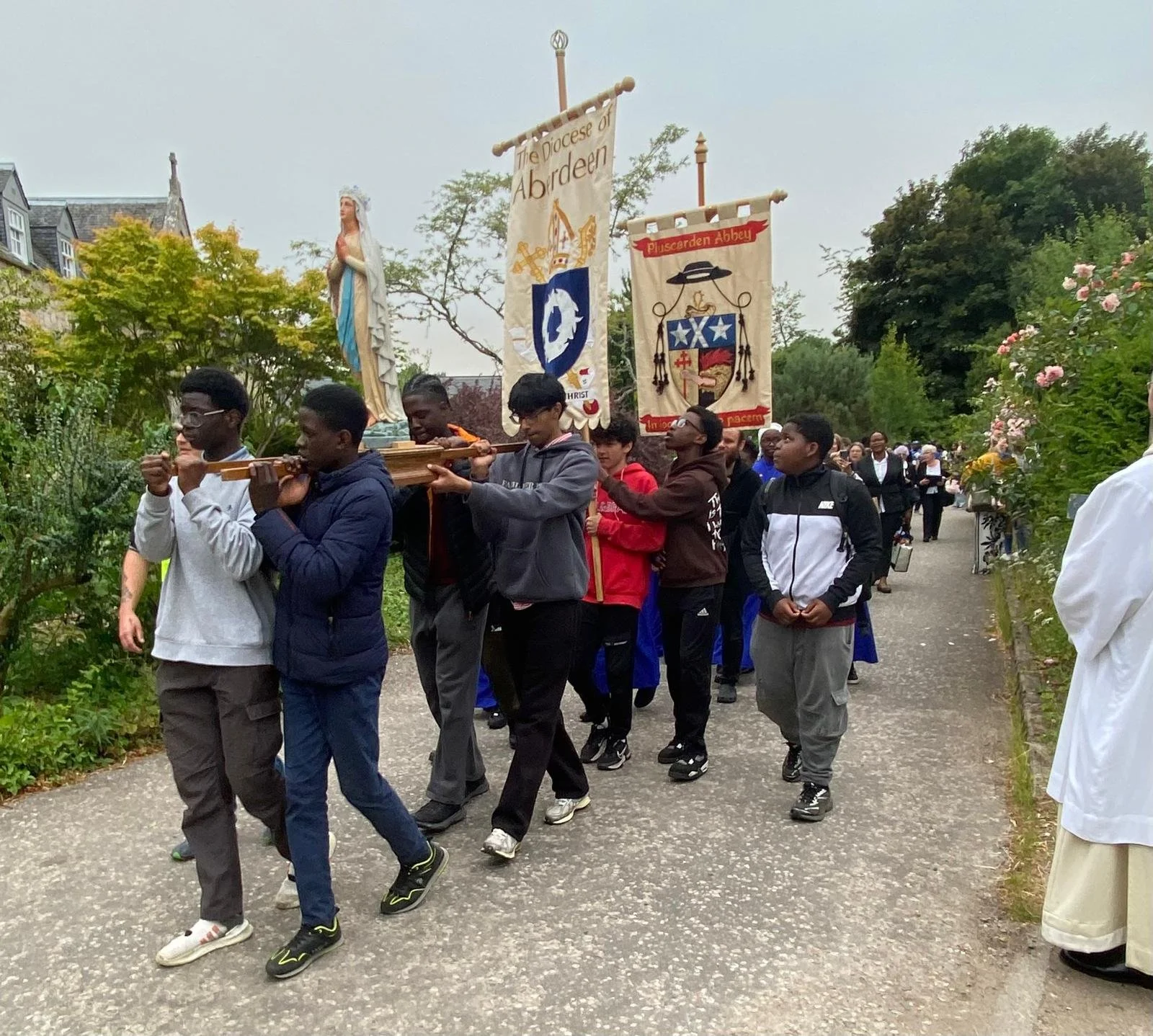 So: this year a group of 32 teenagers from Aberdeen arrived the previous afternoon. They spent the night camping out by St. Scholastica’s guest house. They then joined a good group of other young people who walked in from Elgin, to arrive in plenty of time for the Pilgrimage Mass. All of that was organised and overseen by our Religious Sisters and Diocesan Youth workers, so that the monastic brethren themselves had no related safe-guarding or health-and-safety or organisational headaches whatever!