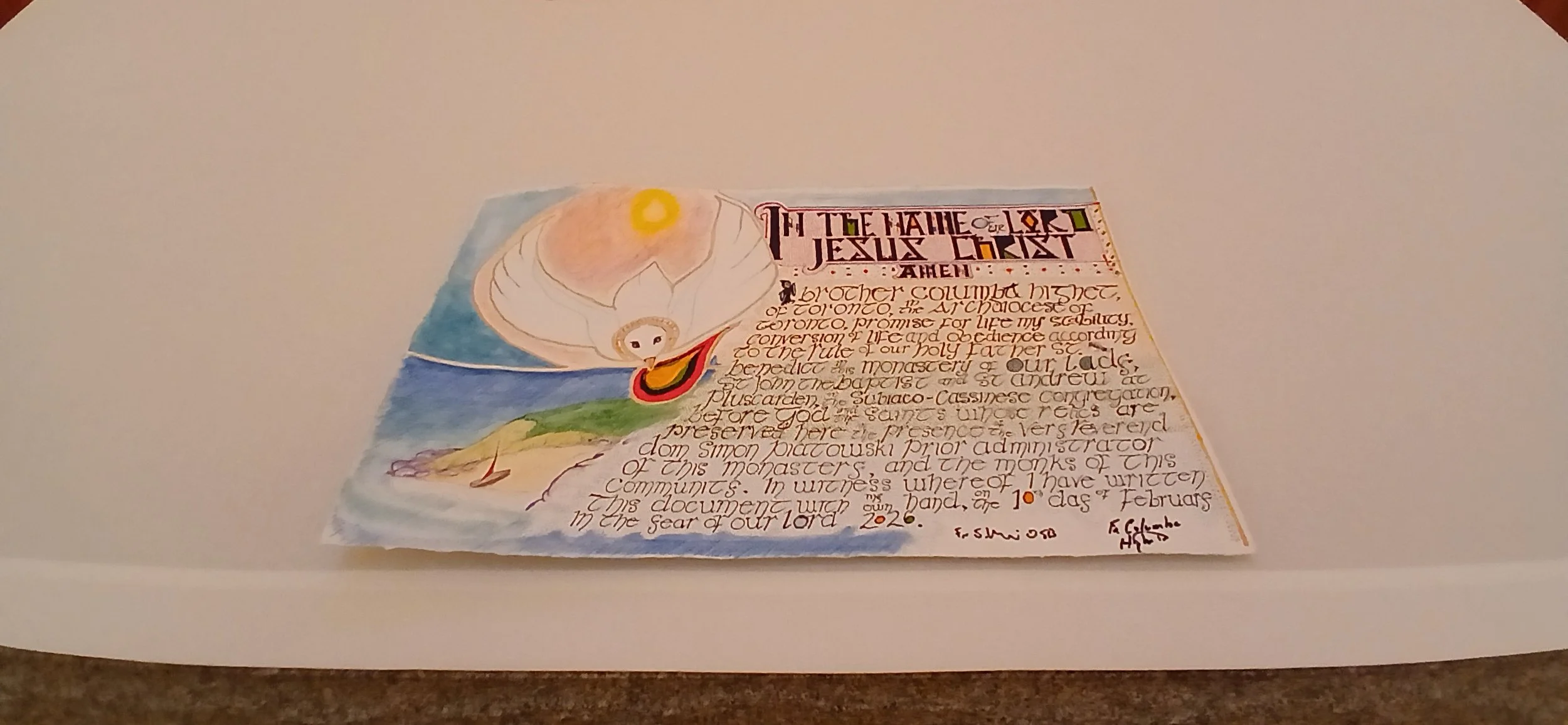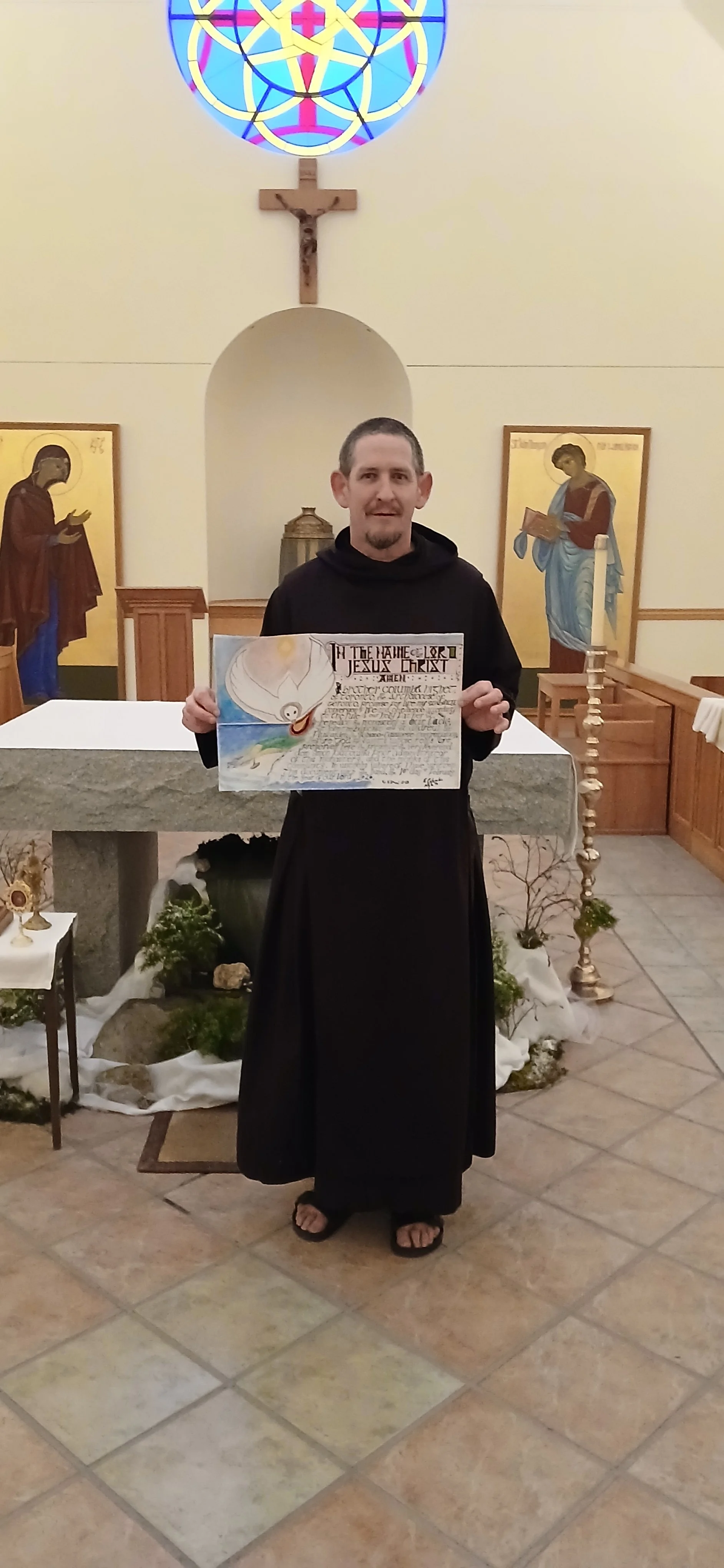 Our picture shows him holding his Profession Chart, written with his own hand, in the Church at Petersham. The art work on the Chart depicts St Columba's beach on Iona, with a dove ("Columba" in Latin) manifesting God's presence and blessing.
