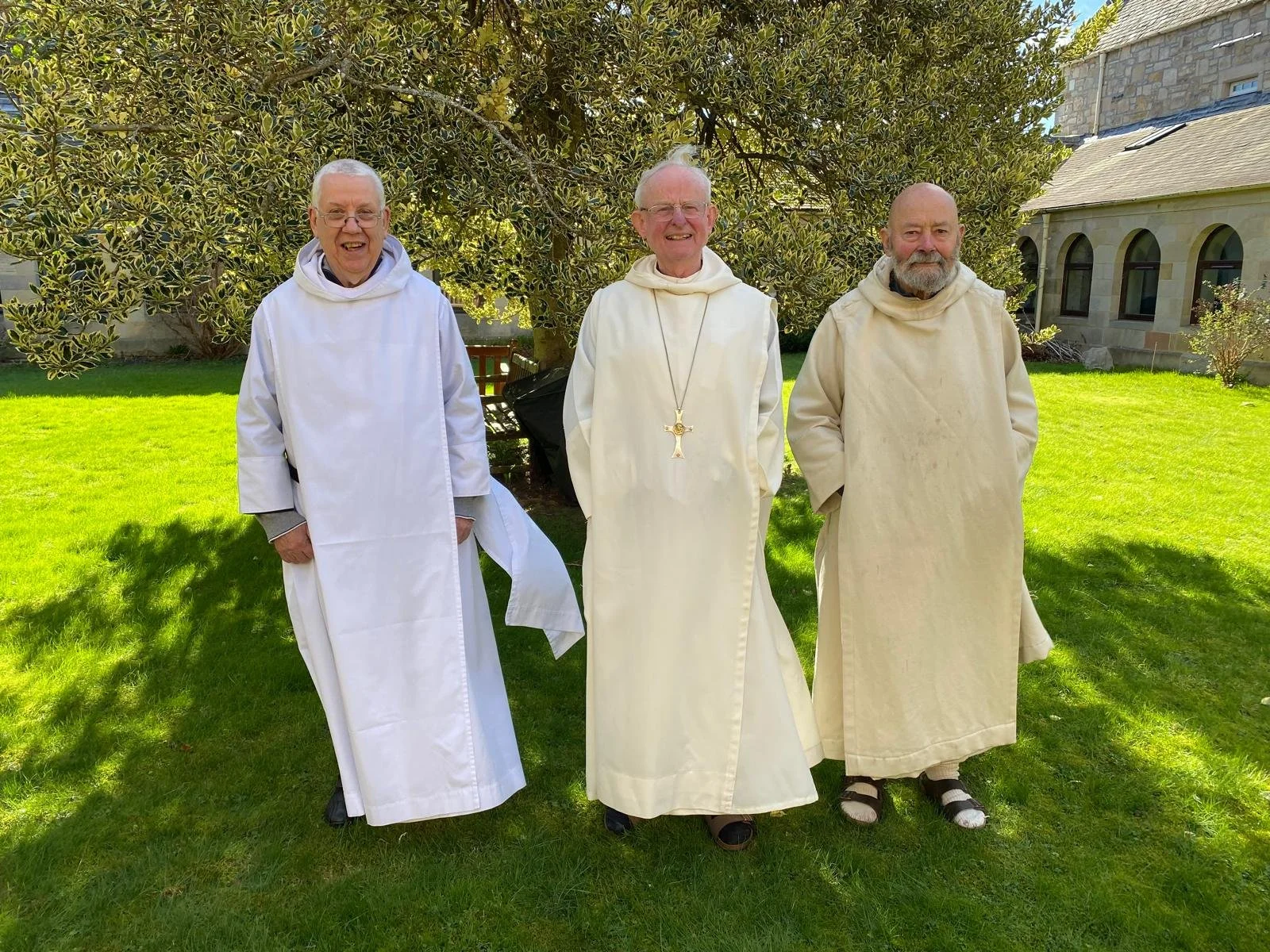 He and Fr. Giles had both been at the original Profession 50 years ago. The three of them are pictured in our Cloister garden in lovely bright Spring sunshine, with the first daffodil of the season just beginning to show its head nearby.